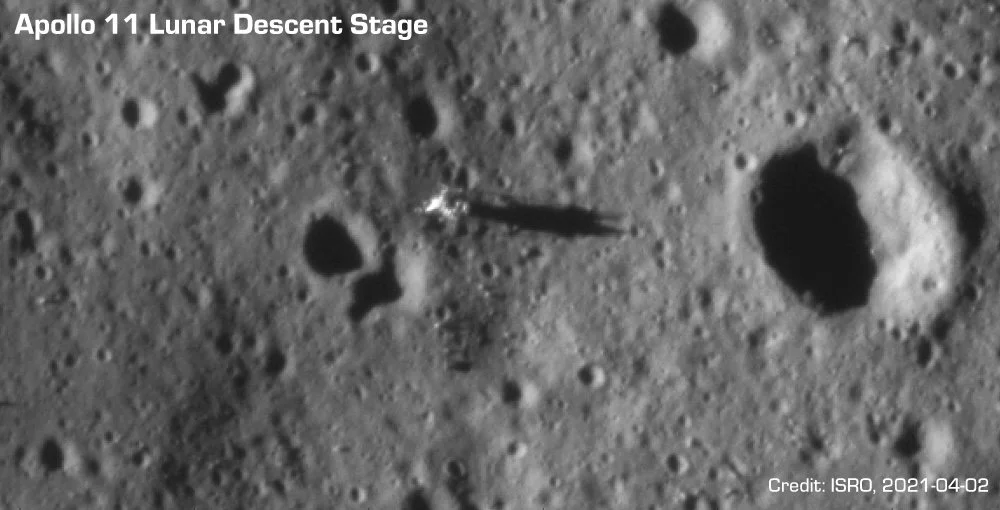 The only way we can actually view the various Apollo landing sights is with satellites that actually orbit the Moon. The Lunar Reconnaissance Orbiter (LRO) can get as close as 20 km above the Moon’s surface during its elliptical orbit. Pictured above is an image of the Apollo 11 landing site captured by India’s space agency with their Chandrayaan 2 orbiter in 2021 from an altitude of 100 km.