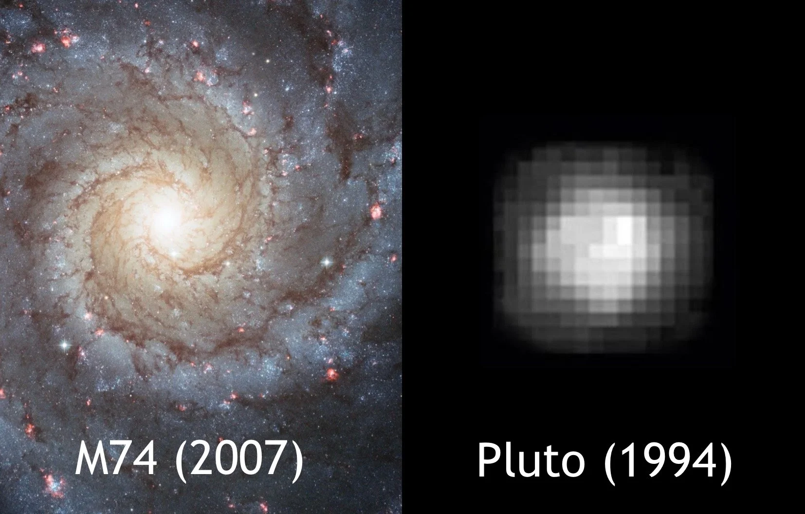 Let’s compare two very different objects: the Phantom Galaxy (M74) and Pluto.