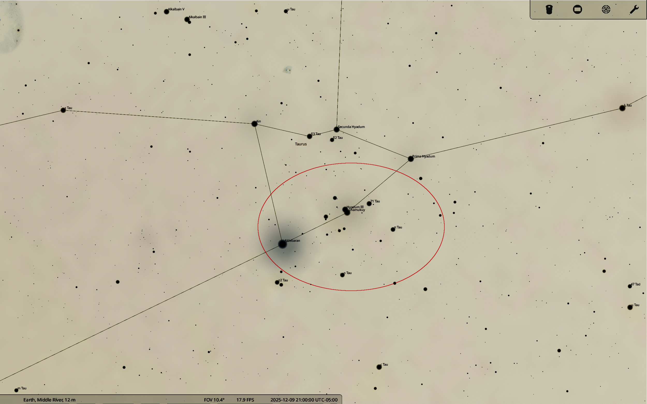 In the above graphic, the Pleiades lie above (west of) Aldebaran, while the Hyades are right next to it. Let’s take a closer look at the latter cluster, marked roughly by the red ellipse: