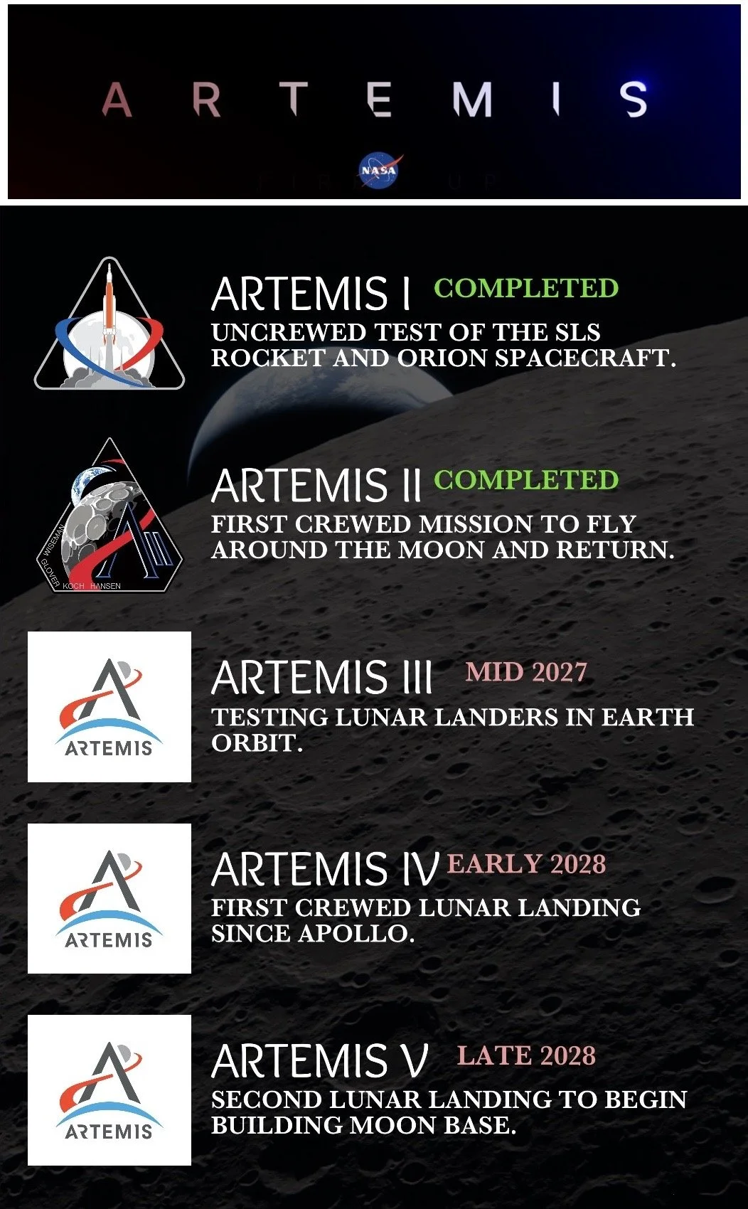 Artemis IV is currently planned for an early-2028 window. It will be the first crewed lunar landing since Apollo 17. The mission will consist of a four-astronaut crew entering lunar orbit and rendezvousing with a lunar lander (which will be placed into orbit ahead of time by a support mission). Two astronauts will transfer to the lander and descend to the lunar surface and conduct extravehicular activities.