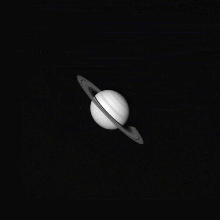 It also continued investigations into Saturn’s rings. Both Voyager probes found that the rings featured irregular dark spots across the main ring system’s plane, like spokes on a bicycle wheel. These spokes appeared dark against the brightly reflected rings, but appeared bright when the rings were not reflecting sunlight. This indicates they scatter reflected light more efficiently in a forward direction.