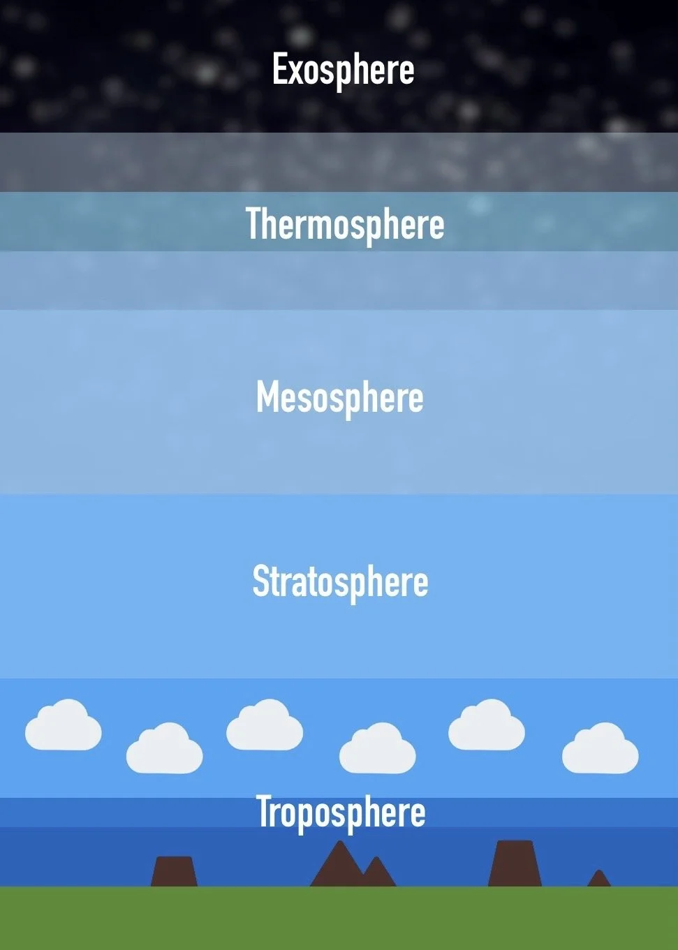 Earth’s atmosphere is a thick layer of gas resting on top of the crust, held to the planet by gravity. It’s made up of mostly nitrogen and oxygen (78% and 21% respectively) and an assortment of other gasses and water vapor. Hot air within the atmosphere rises while cold air sinks. This creates a cycling current called convection which produces various kinds of weather, especially when combined with water. Air being pushed across the surface by this change in temperature and air pressure is what we experience as wind. Rising air carries water vapor with it to form clouds. When the water vapor in the clouds becomes too heavy, it pours down to the ground in the form of rain. When the water vapor is frozen into ice crystals, it falls as snow. Electric charges can build up from the attraction between the negative electrons in the clouds and the positive protons on the ground. When this build up becomes too strong it is discharged in the form of lightning, a flash of superheated plasma that reaches temperatures hotter than the surface of the Sun! The heating and resulting expansion of the air happens so quickly that it causes a sonic boom that we hear as thunder.