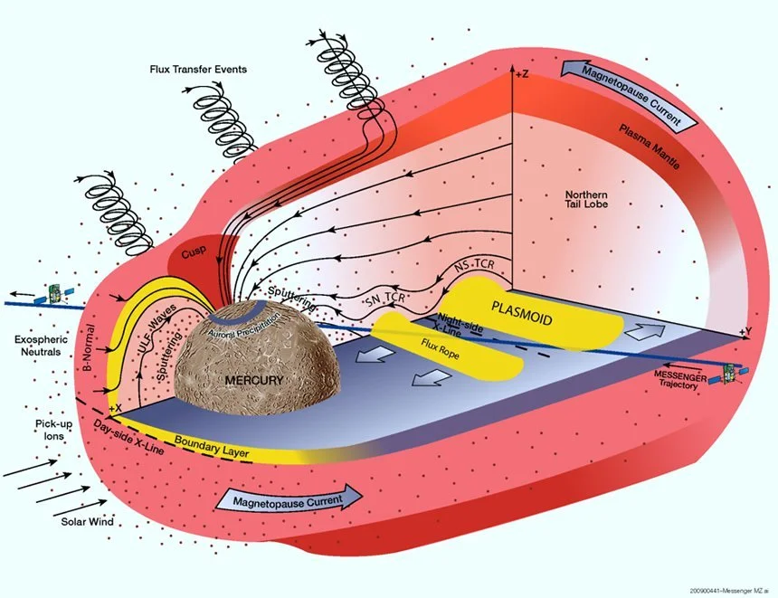 As Mercury is so close to the Sun, the solar wind is particularly punishing. So much so that it frequently twists the planet’s magnetic field up into coils, or colossal magnetic tornadoes. Scientists call these “magnetic flux transfer events.” The solar wind rides the coils of these magnetic tornadoes and slam into the surface, lifting atoms up high into the sky and then Mercury’s gravity pulls them back down. These tornadoes can sometimes be as wide as the entire planet. It is now hypothesized that these invisible magnetic storms actually feed Mercury with material for its very thin, patchy atmosphere.