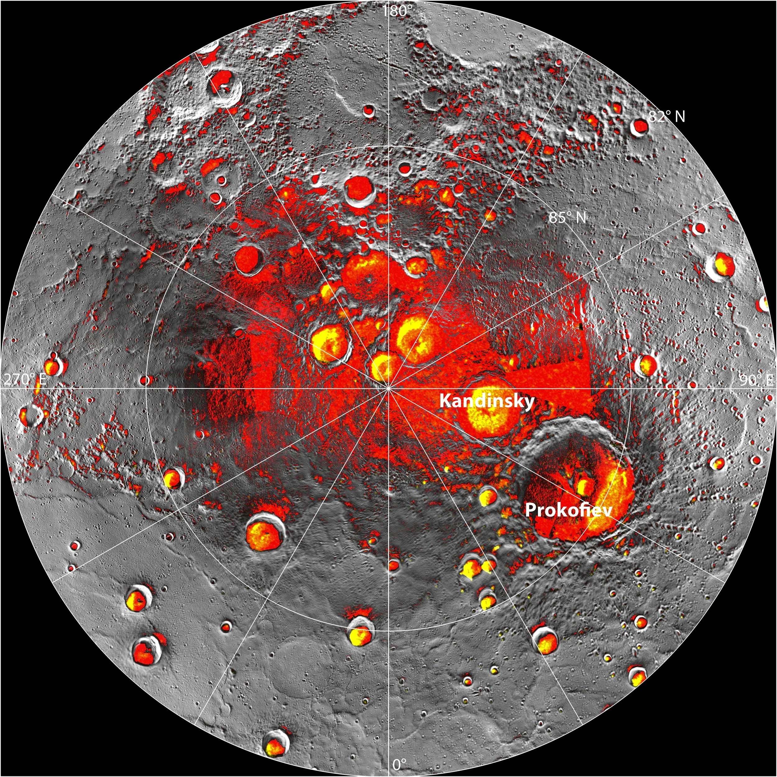 Due to Mercury having almost no axial tilt, there are places within craters around its polar regions that are permanently steeped in shadow. These regions are known as cold traps where water ice is free to pool on the crater floors. These reservoirs were directly observed by the MESSENGER orbiter in 2012 using a reflecting laser to detect the brighter icy surfaces and a spectrometer to detect hydrogen. Water ice was found in craters within 5° of both poles, with some smaller deposits as far as 10° out.