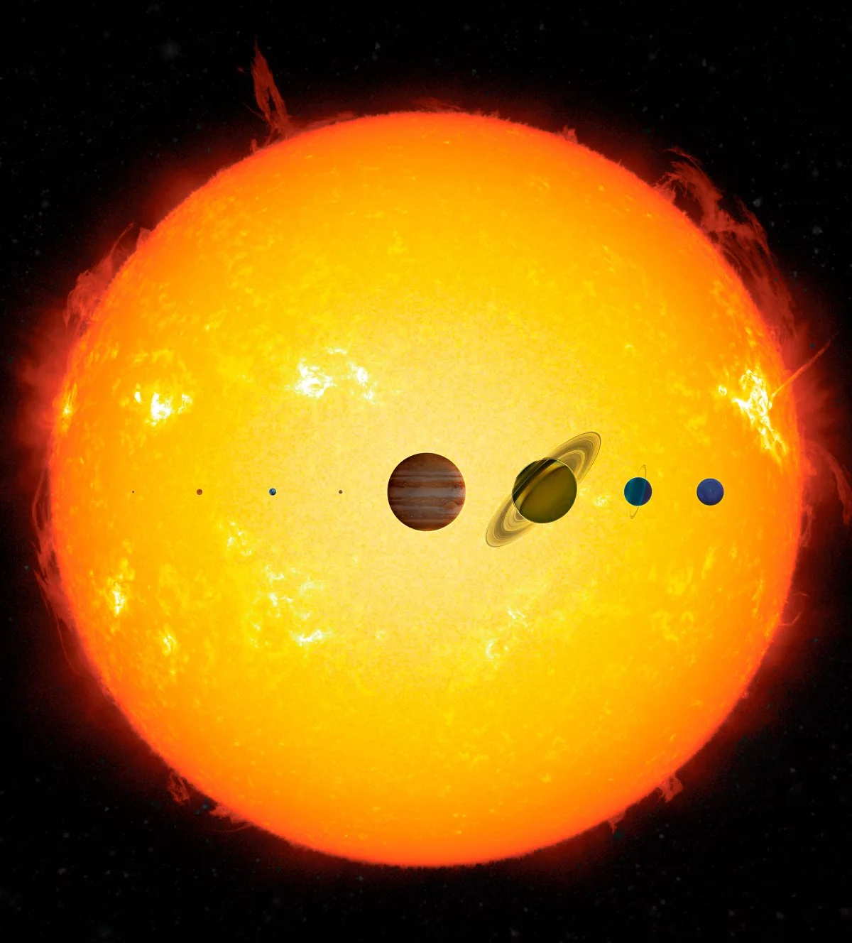 As a G-type star, the Sun is bigger than most stars but nowhere near as big as stars can get. However, it is unmatched in its own domain. The Sun’s diameter is 10 times wider than the largest planet, Jupiter, and 109 times wider than our home planet, Earth. This means that you could fit about 1,000 Jupiters or 1.3 million Earths within the Sun’s entire volume. If a commercial airplane were to fly around the Sun at its surface, traveling at 550 mph, it would take 206 days (6.8 months) to complete one revolution.