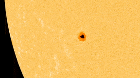 Sunspots are dark blemishes that appear on the Sun’s photosphere. They originate where the Sun’s magnetic field is extremely concentrated and strong. This inhibits the convection of hot plasma from the Sun’s interior to the surface which causes the region to cool down significantly. As a result of the lower temperature, the region becomes darker. Sunspots are often easily visible when looking at the Sun through a solar filter, even unmagnified.