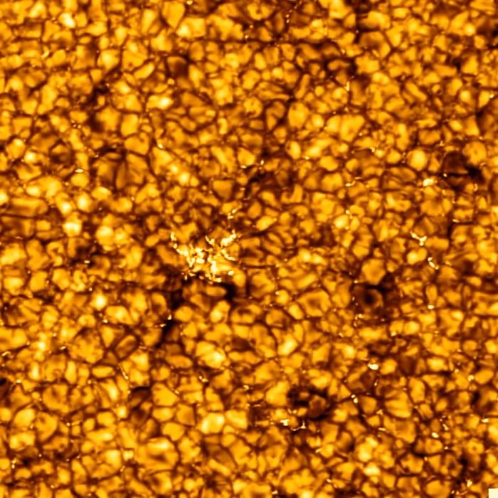 Granules are small cell-like structures that cover the entire photosphere, or “surface,” of the Sun. They bubble up in the bright middle via the convection of hot plasma within the Sun's interior, then after 8-20 minutes of cooling, they sink back down at the darker edges, only to be replaced by another. They tend to be 1,000-2,000 km in diameter, meaning as few as six granules could span the diameter of the Earth.