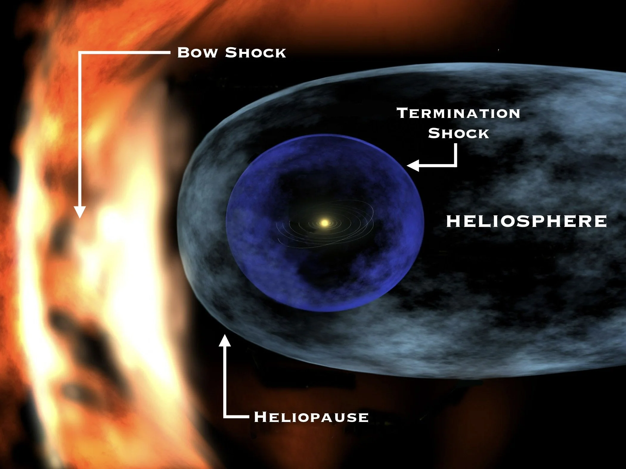 This outward flow inflates a vast bubble known as the heliosphere, which surrounds the solar system and extends beyond the orbit of Pluto. Within this region, the Sun’s magnetic influence dominates over interstellar space. As the wind expands, it slows at the termination shock and meets interstellar resistance at the heliopause, the outer boundary of the Sun’s reach. The heliosphere helps shield the solar system from high-energy galactic cosmic rays and changes in size over the solar cycle. As the Sun orbits the galactic center, the heliosphere plows through the interstellar medium, forming a bow shock, much like a boat plows through water.