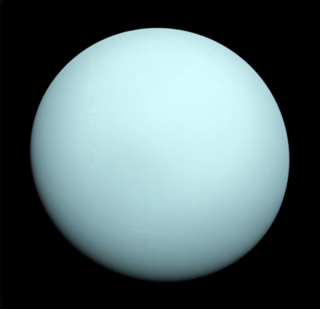As soon as it was discovered, Uranus was immediately categorized as a gas giant due to its large size and gaseous appearance. Uranus has the third-largest diameter and fourth-largest mass of the current eight planets. However, it is substantially smaller, with less than 5% of Jupiter’s mass and 15% of Saturn’s. It also differs in appearance. Where Jupiter and Saturn display distinct bands with warmer tones like orange and beige, Uranus appears as pale cyan, fuzzy and featureless. Upon closer inspection of both Uranus and Neptune by the Voyager 2 space probe in the late 1980’s, which remains the only spacecraft to have ever visited them, scientists learned that these planets are fundamentally different than their gas giant counterparts. While they still mostly consist of hydrogen and helium, Uranus and Neptune were found to contain much higher concentrations of icy volatiles (compounds with very high melting points) such as water, ammonia and methane. This led scientists to recategorize Uranus and Neptune as members of a new class of planet: ice giants.