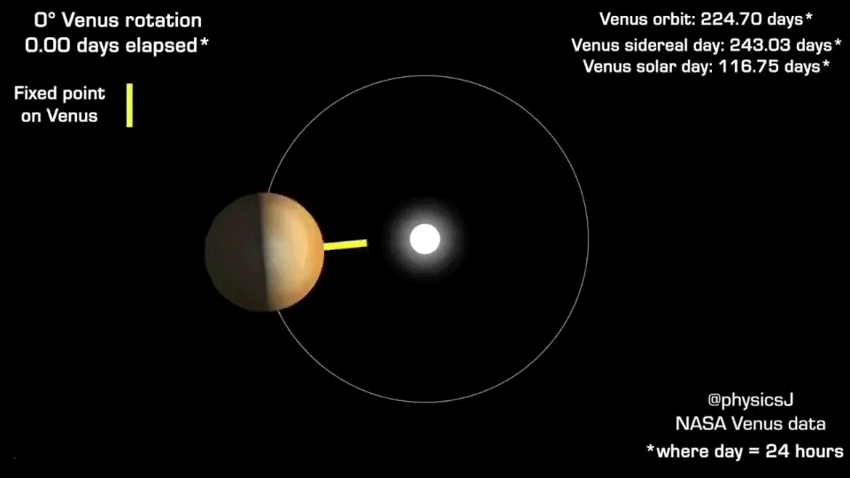 The rotation of Venus is even more peculiar than that of Mercury because it rotates clockwise. Other planets in the solar system rotate counterclockwise which means Venus more or less rotates backwards and it rotates very slowly. So slow, in fact, that a solar day on Venus lasts over half of its year and a sidereal day on Venus lasts longer than its whole year. If you were to stand on the surface of Venus, the Sun would rise in the west, travel across the cloudy, opaque sky for four months, then set in the east followed by four months of pitch-black darkness.
