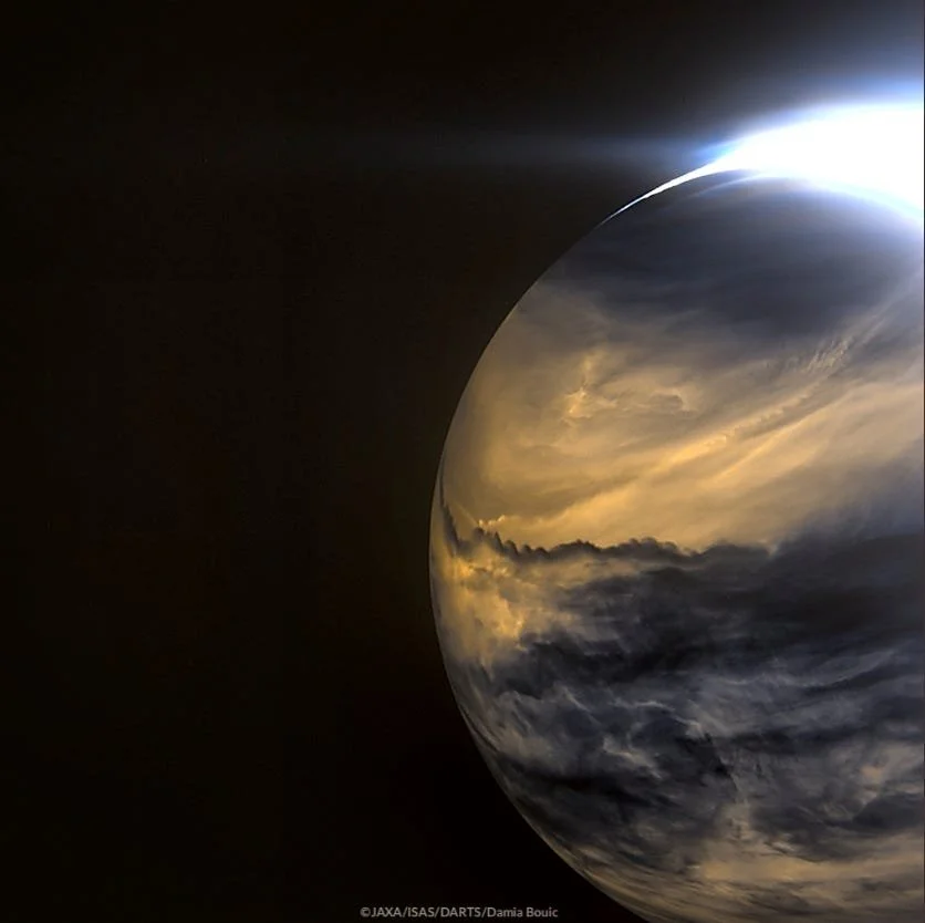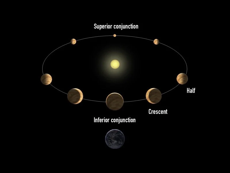 Like Mercury, the orbit of Venus is inferior to Earth’s, meaning it is closer to the Sun so we can only really see it from Earth’s surface during sunrise and sunset as it is otherwise below the horizon or washed out by sunlight. As Venus orbits around the Sun, we can see different sides of it cast in shadow as the angle of the sunlight changes, just like we see with the phases of the Moon as it orbits Earth. Some key differences are that as Venus gets closer to being “new” it gets closer to us and its angular diameter gets bigger and we pretty much never get to see it “full” from Earth as this is when it is on the furthest side of the Sun.